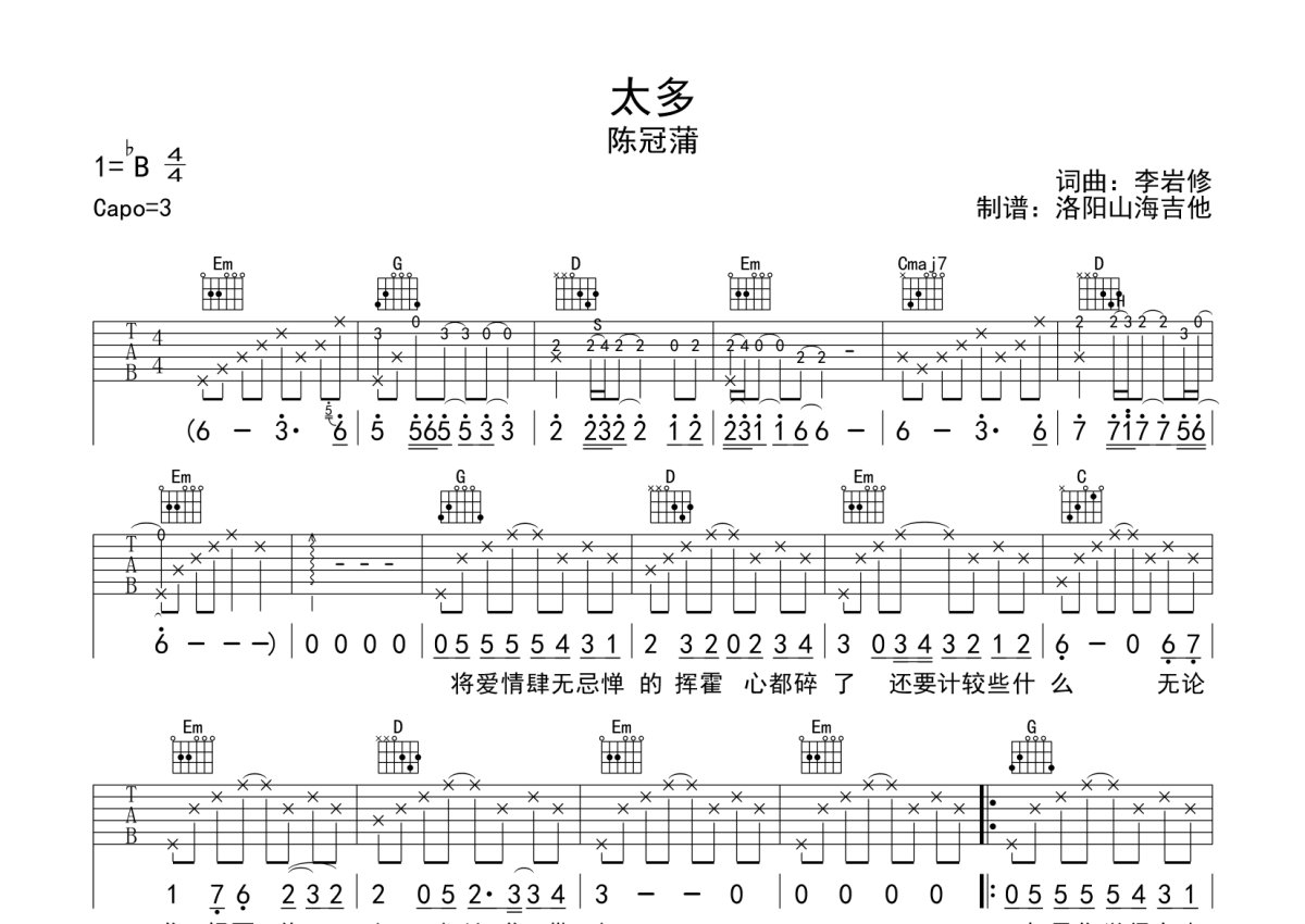 陈冠蒲《太多》吉他谱 - G调弹唱六线谱