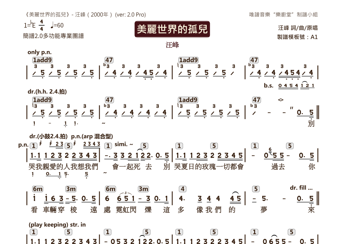 《美丽世界的孤儿》是汪峰汪峰演唱的一首歌曲,2.0版多功能团谱,这份乐队总谱共有两张高清图谱,图谱由 @唯谱音乐"乐厨堂"发布小组 编配上传。