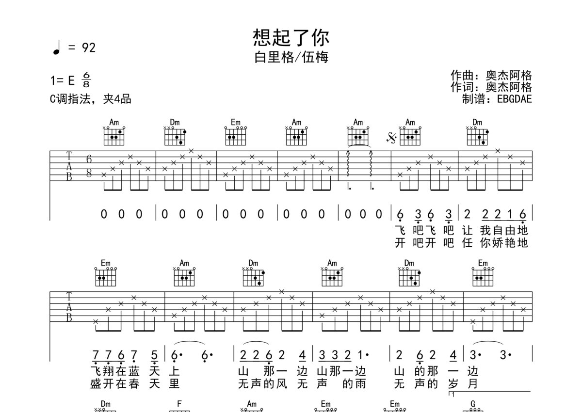 《想起了你》是白里格/伍梅演唱的一首歌曲,拍号为6/8拍,歌曲原调为E调,但由于原调指法比较难,为了方便弹奏,本吉他谱采用的是C调指法编配,变调夹4品弹奏即为原调,当然也可以根据自己的音域改变变调夹位置,或者通过改变和弦调性,以方便自己弹奏,这份吉他谱共有两张高清图谱,图谱由 @EBGDAE 编配上传,图谱使用六线谱编配,包含吉他和弦指法、简谱以及歌词部分,使用这份想起了你吉他谱,可以让你更加方便地掌握这首歌曲的弹唱技巧,快来尝试吧。2张谱,免翻页排版设计。和弦、节奏简单易学,加油!。