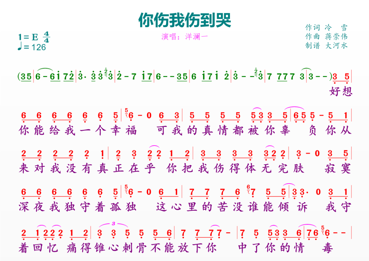 《你伤我伤到哭》是洋澜一演唱的一首歌曲,拍号为4/4拍,歌曲速度为每分钟126拍,这份简谱共有一张高清图谱,图谱由 @临海雪原 编配上传。