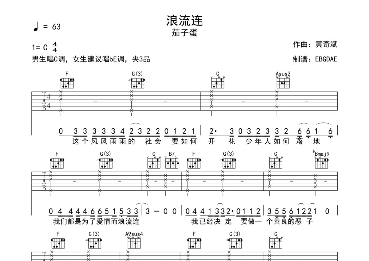 茄子蛋《浪流连》吉他谱 - C调弹唱六线谱