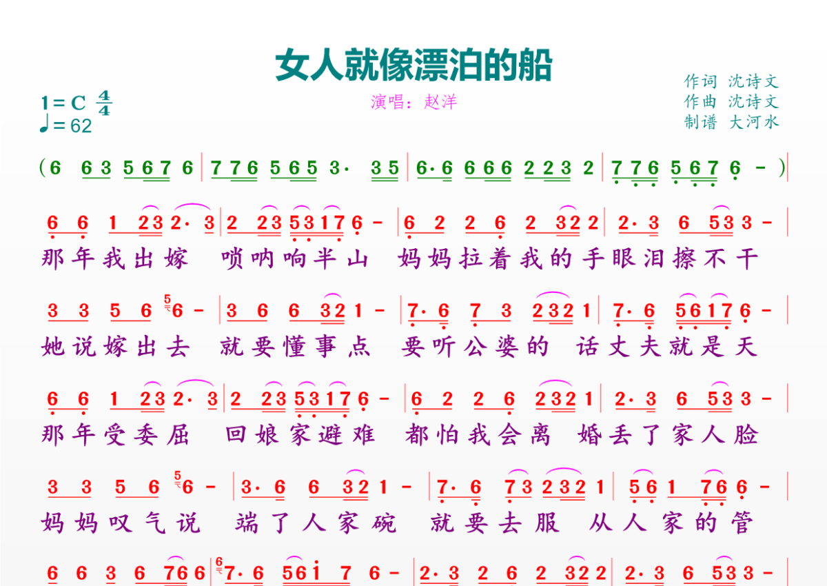 《女人就像漂泊的船》是赵洋演唱的一首歌曲,拍号为4/4拍,歌曲速度为每分钟62拍,这份简谱共有一张高清图谱,图谱由 @临海雪原 编配上传。