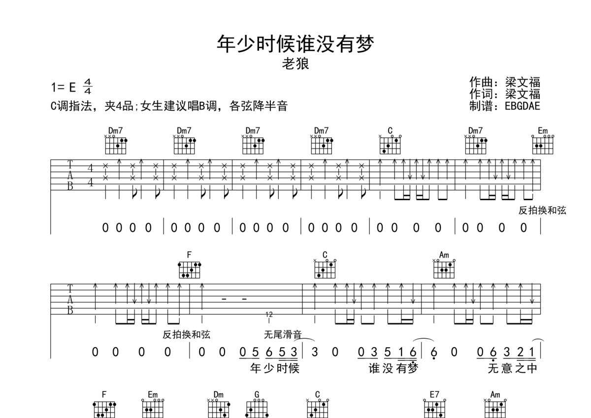 老狼《年少时候谁没有梦》吉他谱 - E调弹唱六线谱