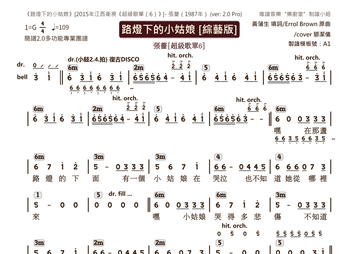 《路灯下的小姑娘(综艺版)》是综艺版演唱的一首歌曲,2.0版多功能团谱,这份乐队总谱共有一张高清图谱,图谱由 @唯谱音乐"乐厨堂"发布小组 编配上传。