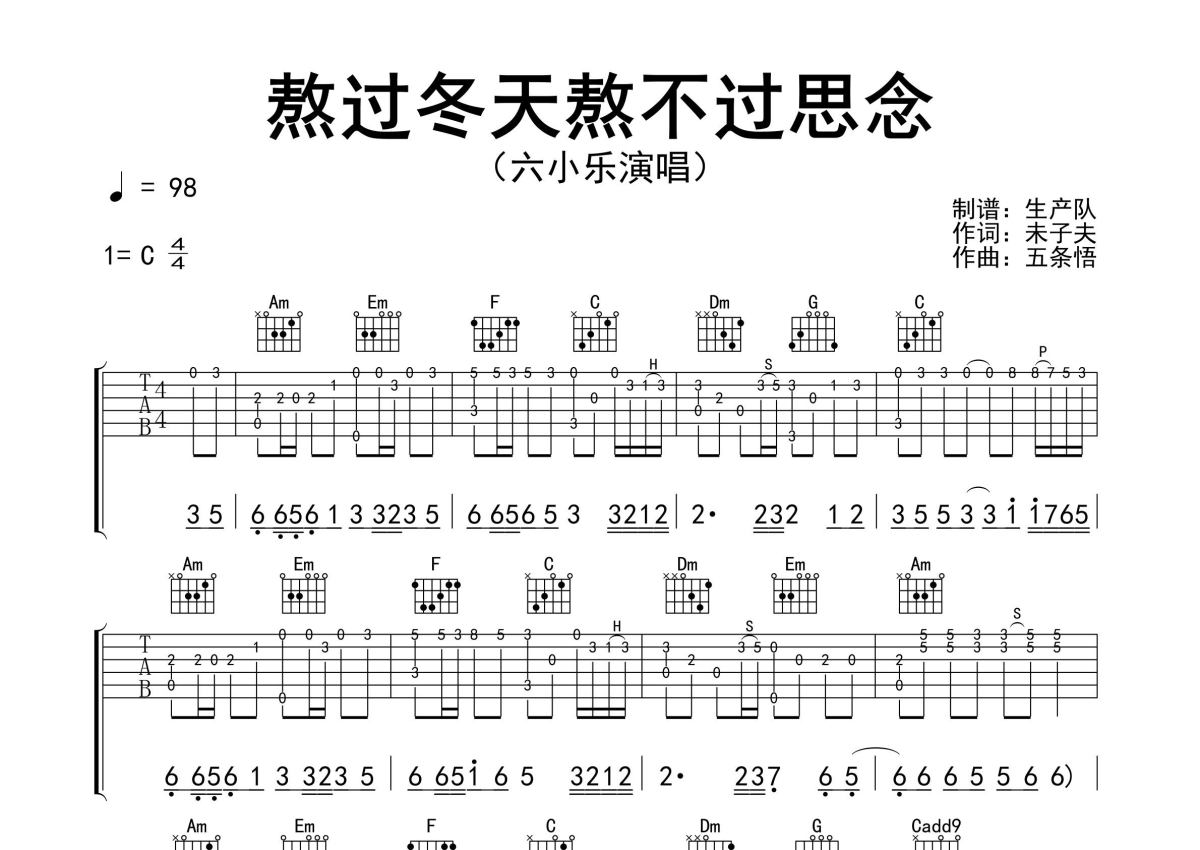 六小乐《熬过冬天熬不过思念》吉他谱 - C调弹唱六线谱 - 精编完美版