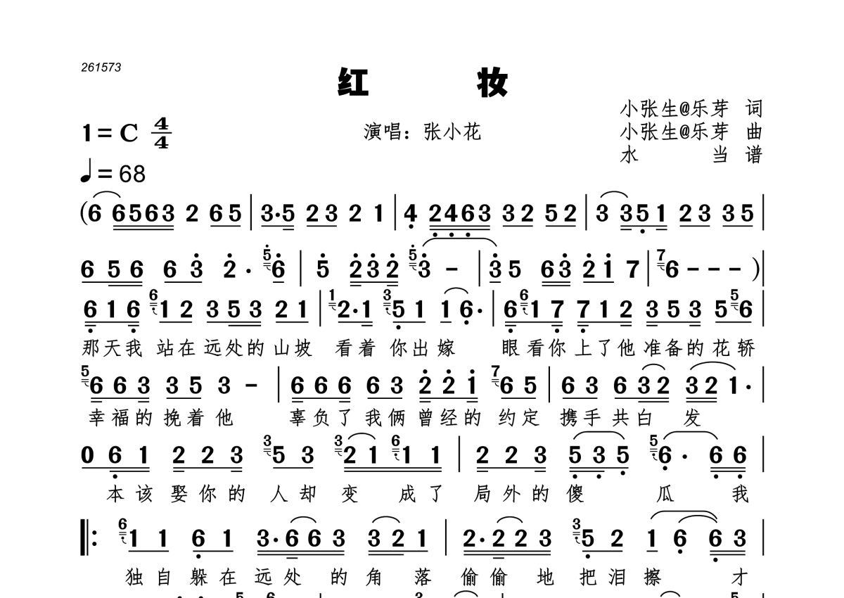 《红妆》是张小花演唱的一首歌曲,拍号为4/4拍,歌曲速度为每分钟68拍,这份简谱共有一张高清图谱,图谱由 @水当 编配上传。