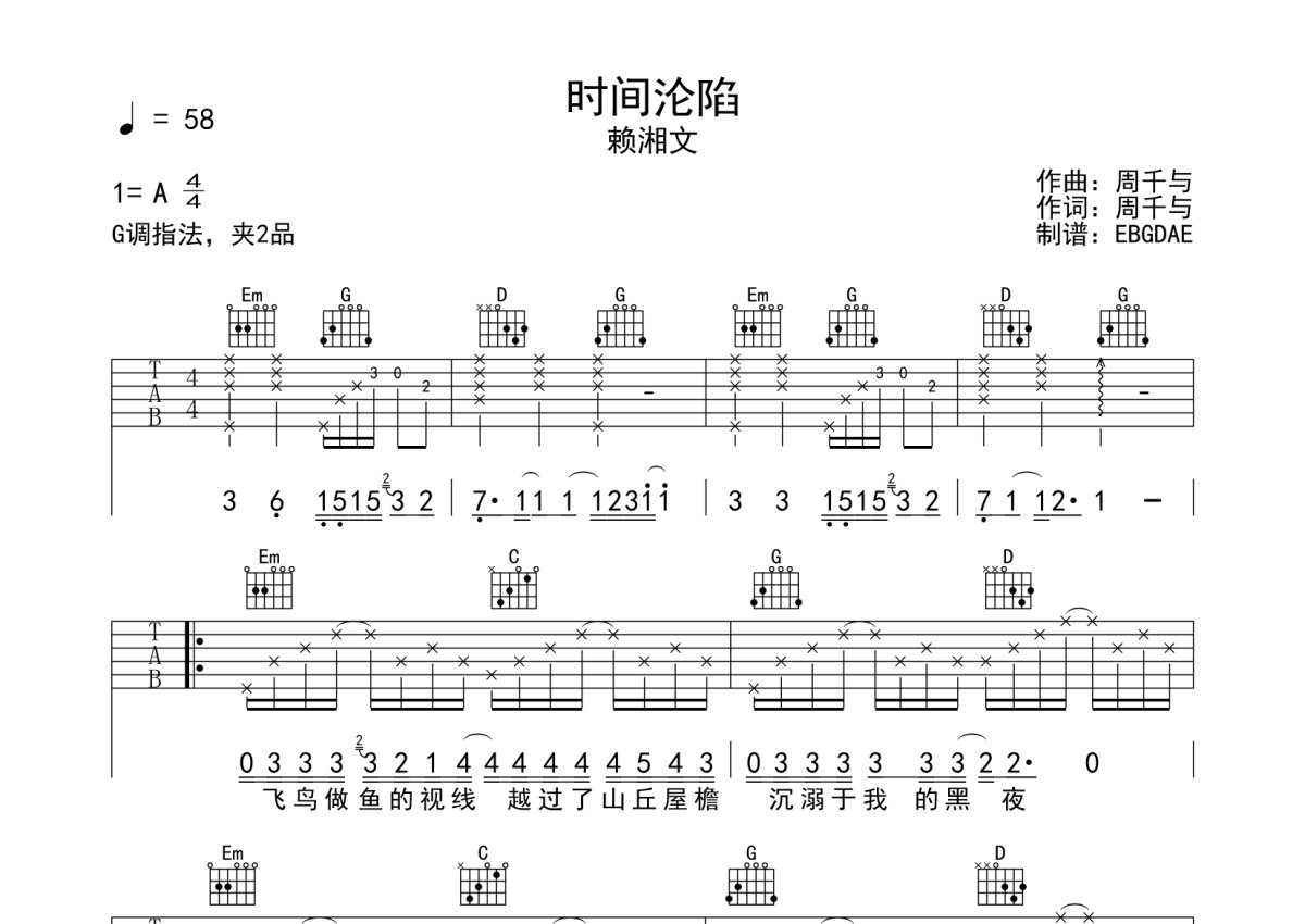 赖湘文《时间沦陷》吉他谱 - G调弹唱六线谱