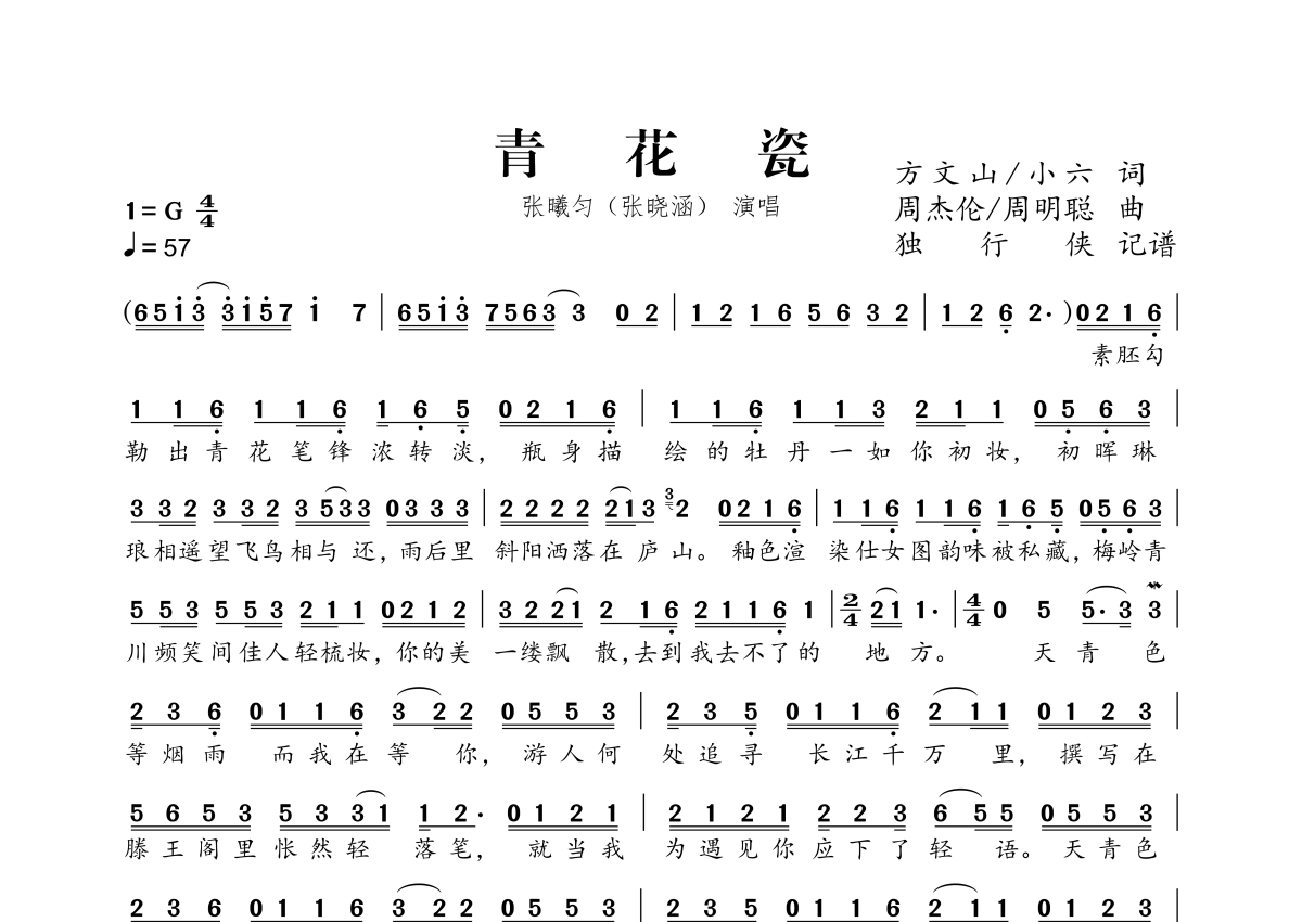 《青花瓷(戏腔版)》是张曦匀演唱的一首歌曲,拍号为4/4拍,歌曲速度为每分钟57拍,这份简谱共有一张高清图谱,图谱由 @独行侠 编配上传。