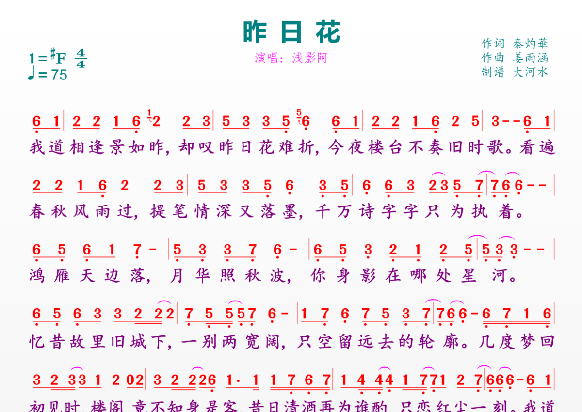 《昨日花》是浅影阿演唱的一首歌曲,拍号为4/4拍,歌曲速度为每分钟75拍,这份简谱共有一张高清图谱,图谱由 @临海雪原 编配上传。