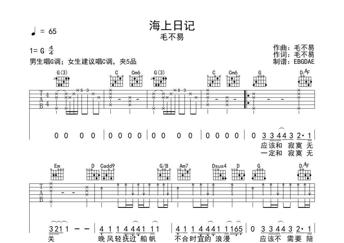 毛不易《海上日记》吉他谱 - G调弹唱六线谱