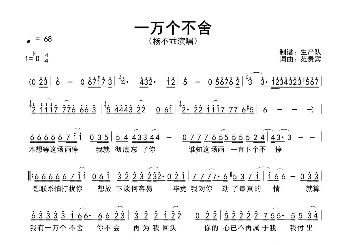《一万个不舍》是杨不乖演唱的一首歌曲,原版简谱,拍号为4/4拍,歌曲速度为每分钟68拍,这份简谱共有一张高清图谱,图谱由 @生产队 编配上传杨不乖演唱的歌曲《一万个不舍》原版简谱,含精准的前奏、间奏、尾奏solo编配,精编完美版,优质推荐!。