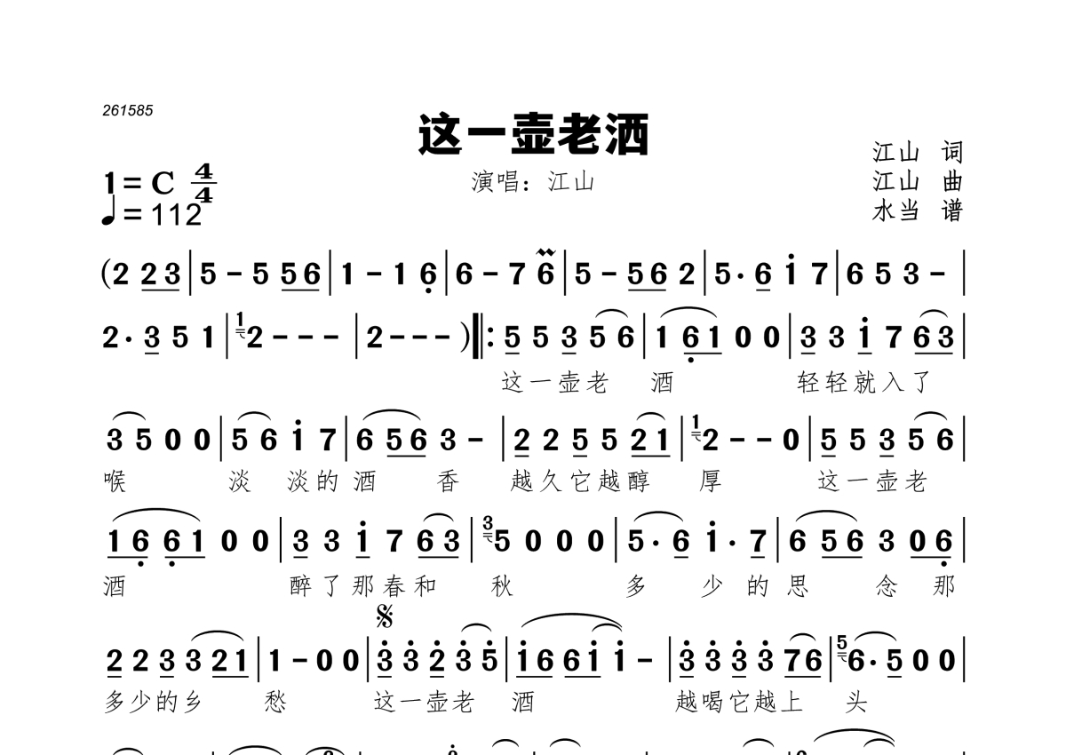 《这一壶老洒》是江山演唱的一首歌曲,拍号为4/4拍,歌曲速度为每分钟112拍,这份简谱共有一张高清图谱,图谱由 @水当 编配上传。