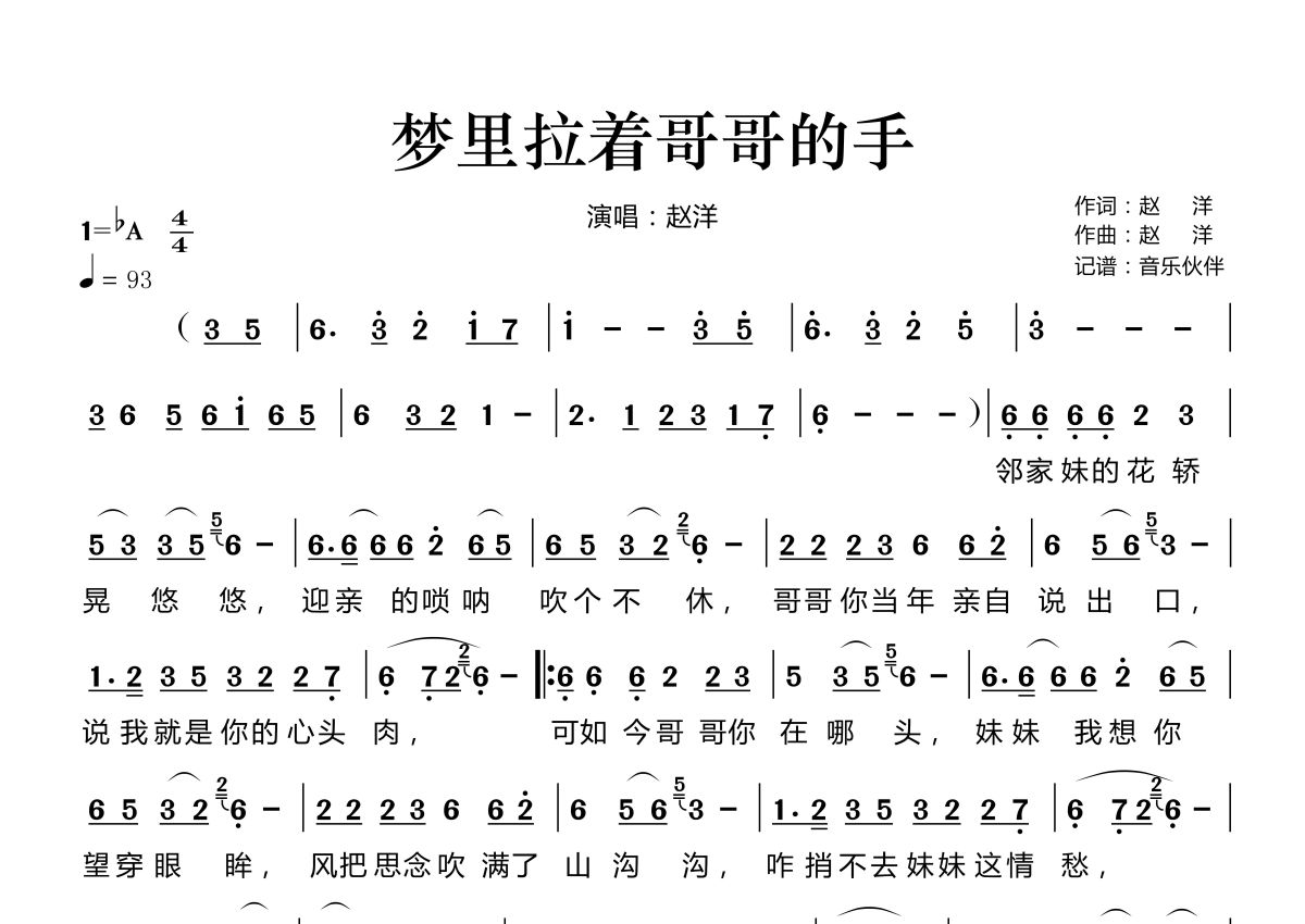 梦里拉着哥哥的手简谱 - 赵洋演唱
