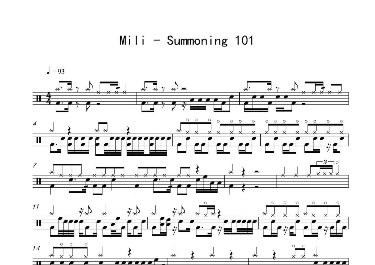 《Summoning 101》是Mili演唱的一首歌曲,歌曲速度为每分钟93拍,这份架子鼓谱共有两张高清图谱,图谱由 @音符喷血者 编配上传,图谱使用五线谱编配,使用这份Summoning 101架子鼓谱,你将能够轻松地敲打出这首Mili的Summoning 101,快来尝试吧。