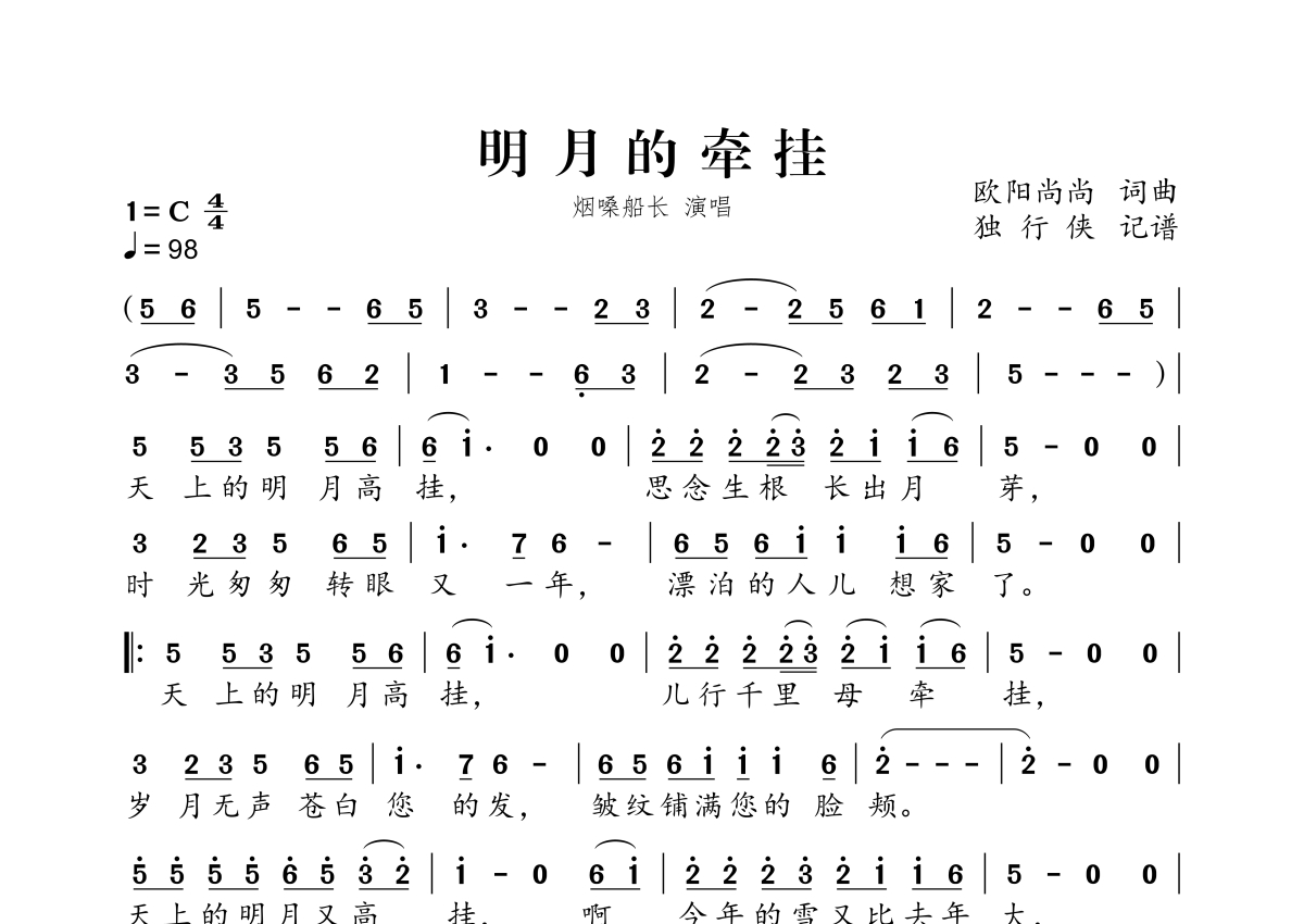 《明月的牵挂》是烟嗓船长演唱的一首歌曲,拍号为4/4拍,歌曲速度为每分钟98拍,这份简谱共有一张高清图谱,图谱由 @独行侠 编配上传。