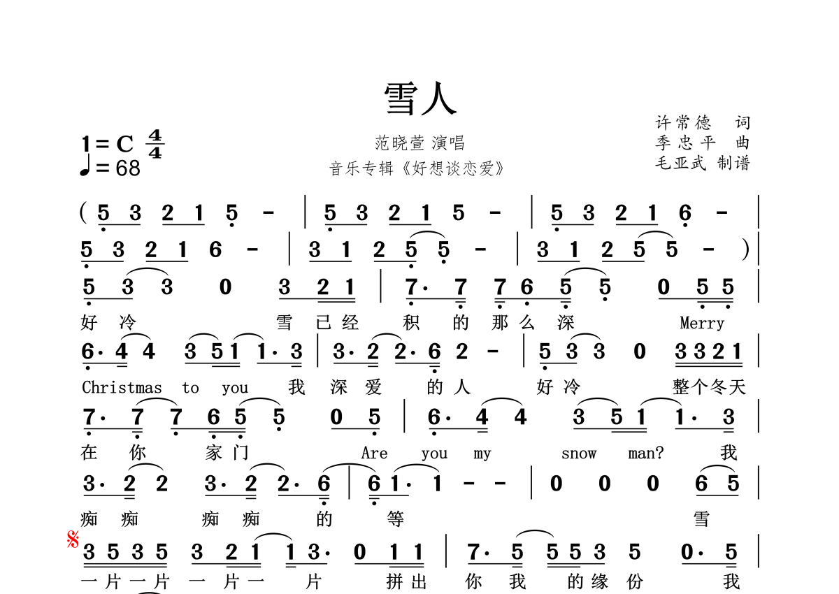 雪人简谱 - 范晓萱演唱
