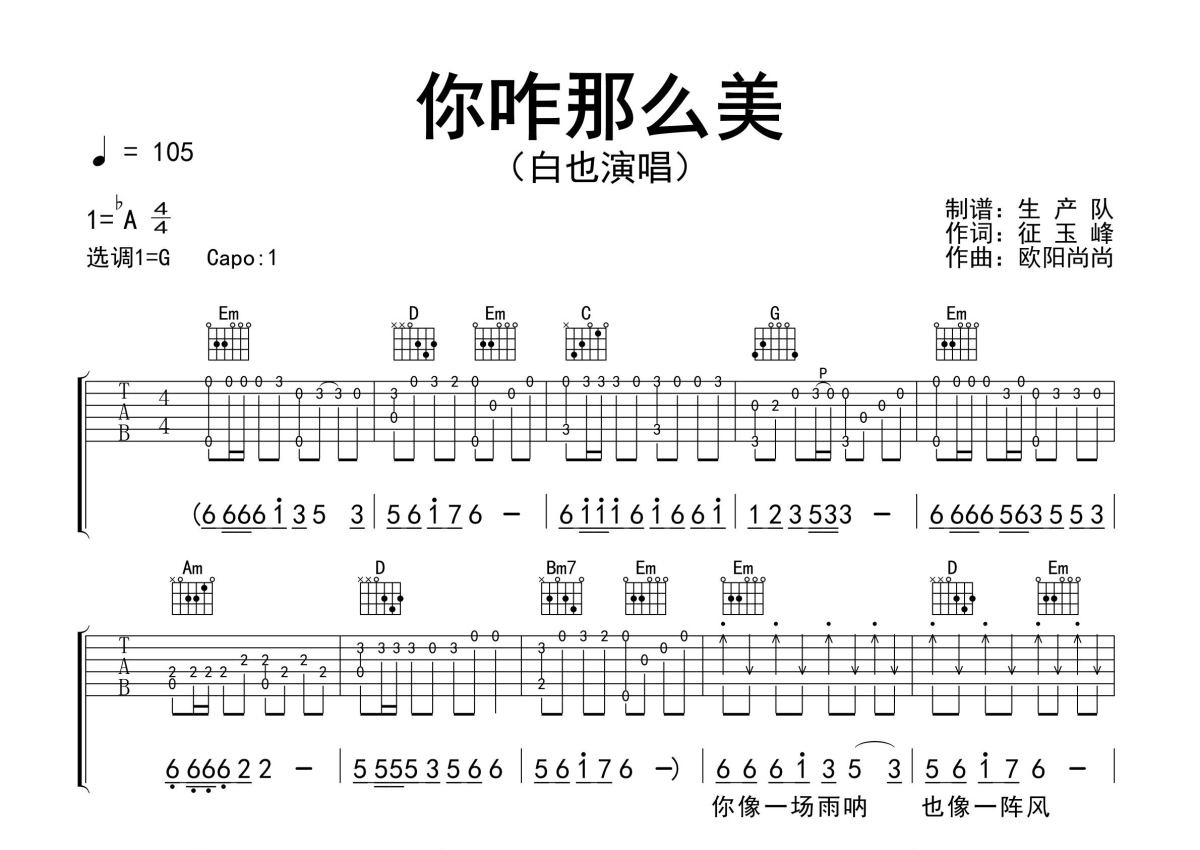 《你咋那么美》是白也演唱的一首歌曲,精编完美版,拍号为4/4拍,歌曲速度为每分钟105拍,歌曲原调为Ab调,但由于原调指法比较难,为了方便弹奏,本吉他谱采用的是G调指法编配,变调夹1品弹奏即为原调,当然也可以根据自己的音域改变变调夹位置,或者通过改变和弦调性,以方便自己弹奏,这份吉他谱共有两张高清图谱,图谱由 @生产队 编配上传,图谱使用六线谱编配,包含吉他和弦指法、简谱以及歌词部分,使用这份你咋那么美吉他谱,可以让你更加方便地掌握这首歌曲的弹唱技巧,快来尝试吧。白也演唱的歌曲《你咋那么美》原版吉他谱,含精准的前奏、间奏、尾奏solo编配,精编完美版,优质推荐!。
