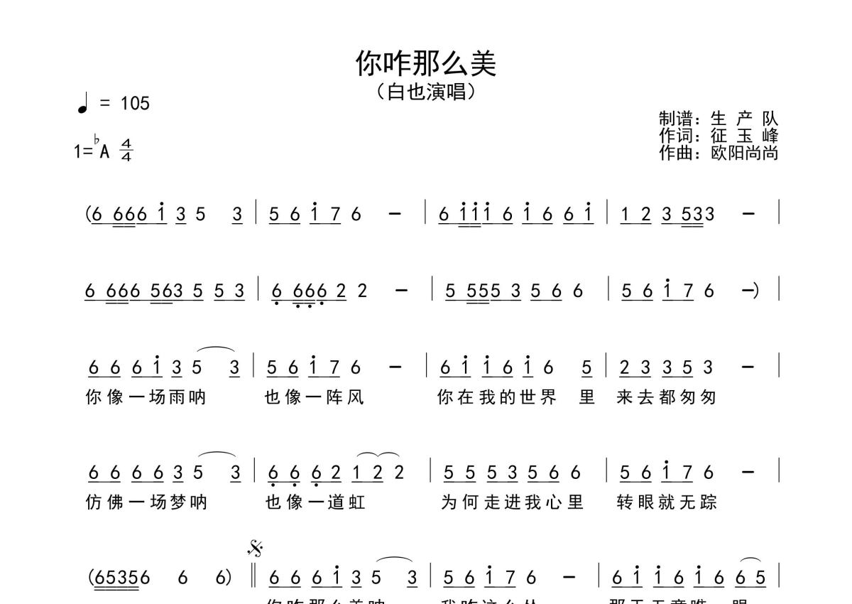 《你咋那么美》是白也演唱的一首歌曲,原版简谱,拍号为4/4拍,歌曲速度为每分钟105拍,这份简谱共有一张高清图谱,图谱由 @生产队 编配上传白也演唱的歌曲《你咋那么美》原版简谱,含精准的前奏、间奏、尾奏solo编配,精编完美版,优质推荐!。