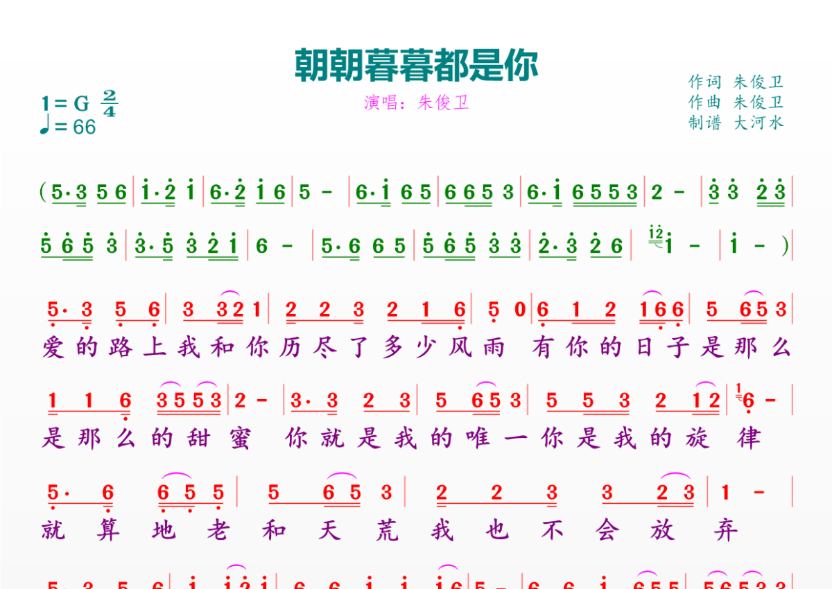《朝朝暮暮都是你》是朱俊卫演唱的一首歌曲,拍号为2/4拍,歌曲速度为每分钟66拍,这份简谱共有一张高清图谱,图谱由 @临海雪原 编配上传。