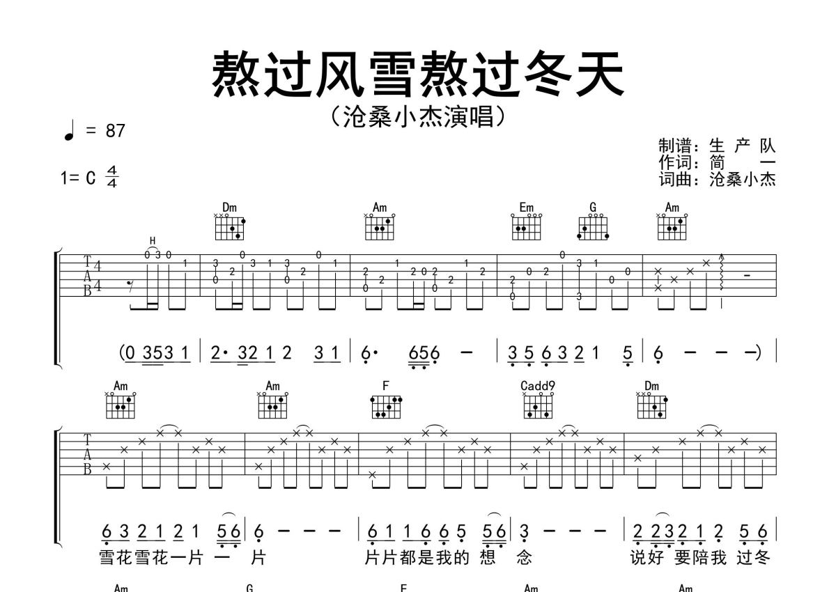 《熬过风雪熬过冬天》是沧桑小杰演唱的一首歌曲,精编完美版,拍号为4/4拍,歌曲速度为每分钟87拍,歌曲原调为C调,本吉他谱采用的是C调指法编配,演奏时不需要使用变调夹即为原调,这份吉他谱共有两张高清图谱,图谱由 @生产队 编配上传,图谱使用六线谱编配,包含吉他和弦指法、简谱以及歌词部分,使用这份熬过风雪熬过冬天吉他谱,可以让你更加方便地掌握这首歌曲的弹唱技巧,快来尝试吧。沧桑小杰演唱的歌曲《熬过风雪熬过冬天》原版吉他谱,含精准的前奏、间奏solo编配,精编完美版,优质推荐!。