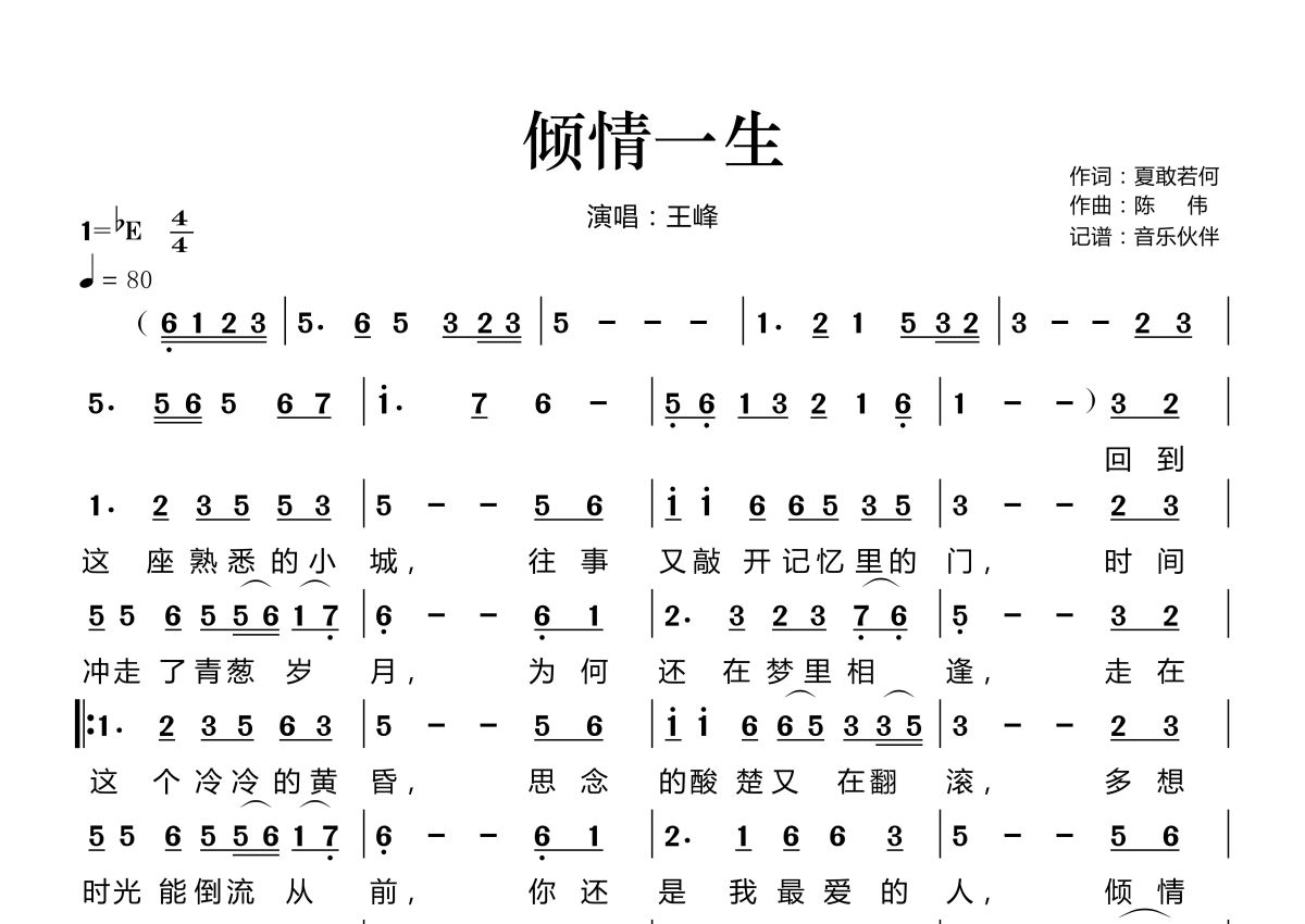《倾情一生》是王峰演唱的一首歌曲,拍号为4/4拍,歌曲速度为每分钟80拍,这份简谱共有一张高清图谱,图谱由 @音乐伙伴 编配上传。