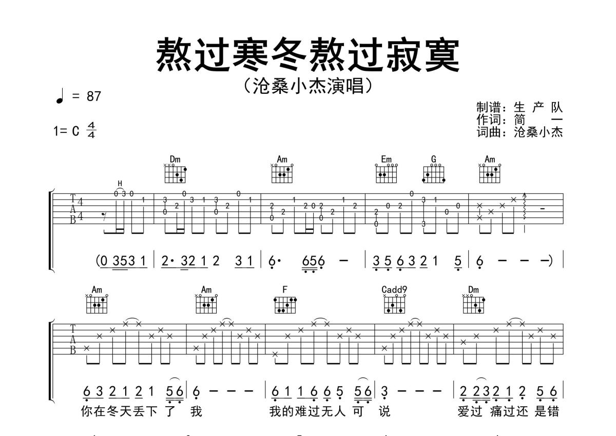 《熬过寒冬熬过寂寞》是沧桑小杰演唱的一首歌曲,精编完美版,拍号为4/4拍,歌曲速度为每分钟87拍,歌曲原调为C调,本吉他谱采用的是C调指法编配,演奏时不需要使用变调夹即为原调,这份吉他谱共有两张高清图谱,图谱由 @生产队 编配上传,图谱使用六线谱编配,包含吉他和弦指法、简谱以及歌词部分,使用这份熬过寒冬熬过寂寞吉他谱,可以让你更加方便地掌握这首歌曲的弹唱技巧,快来尝试吧。沧桑小杰演唱的歌曲《熬过寒冬熬过寂寞》原版吉他谱,含精准的前奏、间奏solo编配,精编完美版,优质推荐!。