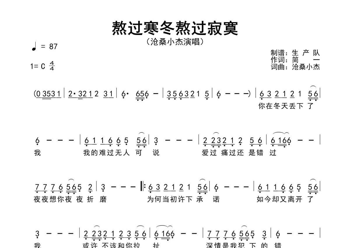 《熬过寒冬熬过寂寞》是沧桑小杰演唱的一首歌曲,原版简谱,拍号为4/4拍,歌曲速度为每分钟87拍,这份简谱共有一张高清图谱,图谱由 @生产队 编配上传沧桑小杰演唱的歌曲《熬过寒冬熬过寂寞》原版简谱,含精准的前奏、间奏solo编配,精编完美版,优质推荐!。