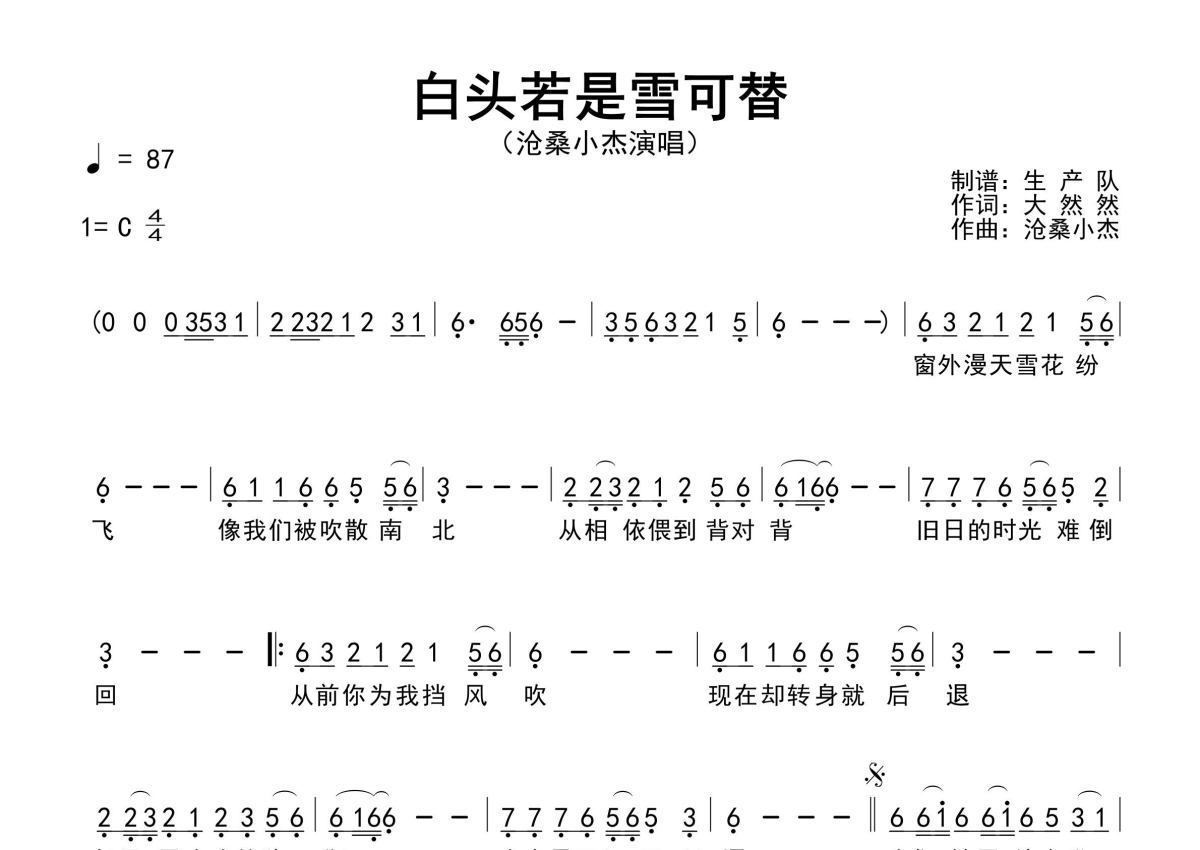 《白头若是雪可替》是沧桑小杰演唱的一首歌曲,原版简谱,拍号为4/4拍,歌曲速度为每分钟87拍,这份简谱共有一张高清图谱,图谱由 @生产队 编配上传沧桑小杰演唱的歌曲《白头若是雪可替》原版简谱,含精准的前奏、间奏solo编配,精编完美版,优质推荐!。