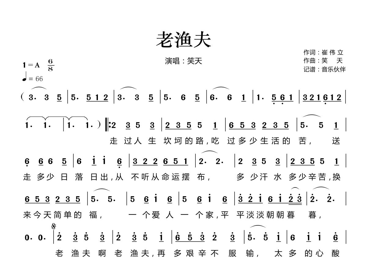 《老渔夫》是笑天演唱的一首歌曲,拍号为6/8拍,歌曲速度为每分钟66拍,这份简谱共有一张高清图谱,图谱由 @音乐伙伴 编配上传。
