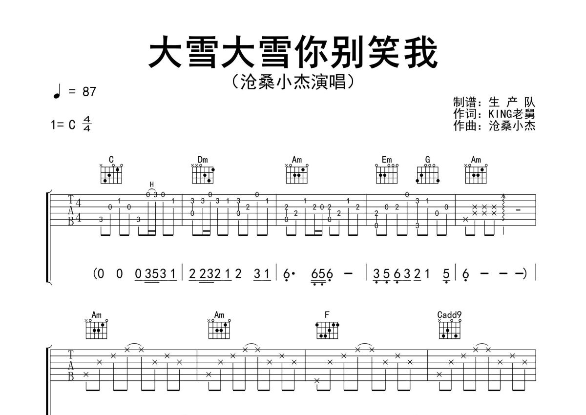 《大雪大雪你别笑我》是沧桑小杰演唱的一首歌曲,精编完美版,拍号为4/4拍,歌曲速度为每分钟87拍,歌曲原调为C调,本吉他谱采用的是C调指法编配,演奏时不需要使用变调夹即为原调,这份吉他谱共有三张高清图谱,图谱由 @生产队 编配上传,图谱使用六线谱编配,包含吉他和弦指法、简谱以及歌词部分,使用这份大雪大雪你别笑我吉他谱,可以让你更加方便地掌握这首歌曲的弹唱技巧,快来尝试吧。沧桑小杰演唱的歌曲《大雪大雪你别笑我》原版吉他谱,含精准的前奏、间奏solo编配,精编完美版,优质推荐!。
