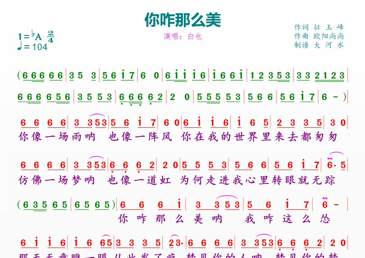 《你咋那么美》是白也演唱的一首歌曲,拍号为2/4拍,歌曲速度为每分钟104拍,这份简谱共有一张高清图谱,图谱由 @临海雪原 编配上传。