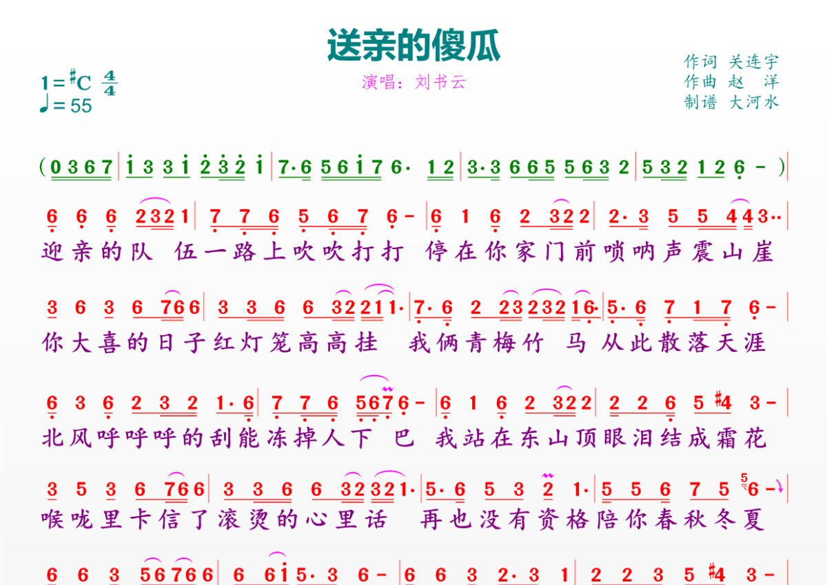 《送亲的傻瓜》是刘书云演唱的一首歌曲,拍号为4/4拍,歌曲速度为每分钟55拍,这份简谱共有一张高清图谱,图谱由 @临海雪原 编配上传。