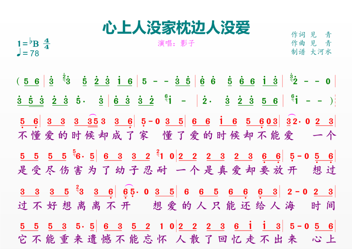《心上人没家枕边人没爱》是影子演唱的一首歌曲,拍号为4/4拍,歌曲速度为每分钟78拍,这份简谱共有一张高清图谱,图谱由 @临海雪原 编配上传。