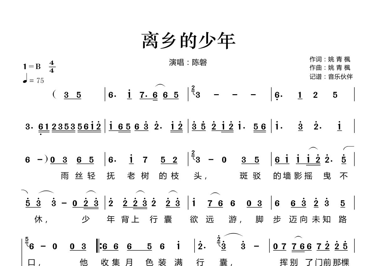 《离乡的少年》是陈磐演唱的一首歌曲,拍号为4/4拍,歌曲速度为每分钟75拍,这份简谱共有两张高清图谱,图谱由 @音乐伙伴 编配上传。