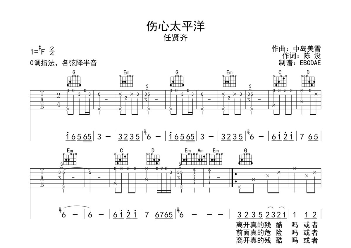 任贤齐《伤心太平洋》吉他谱 - G调弹唱六线谱