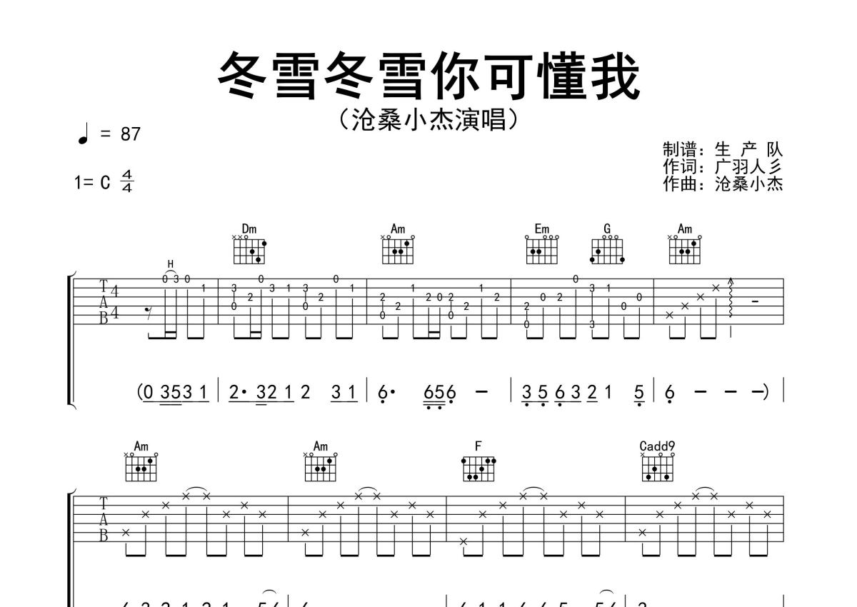 《冬雪冬雪你可懂我》是沧桑小杰演唱的一首歌曲,精编完美版,拍号为4/4拍,歌曲速度为每分钟87拍,歌曲原调为C调,本吉他谱采用的是C调指法编配,演奏时不需要使用变调夹即为原调,这份吉他谱共有三张高清图谱,图谱由 @生产队 编配上传,图谱使用六线谱编配,包含吉他和弦指法、简谱以及歌词部分,使用这份冬雪冬雪你可懂我吉他谱,可以让你更加方便地掌握这首歌曲的弹唱技巧,快来尝试吧。沧桑小杰演唱的歌曲《冬雪冬雪你可懂我》原版吉他谱,含精准的前奏、间奏solo编配,精编完美版,优质推荐!。