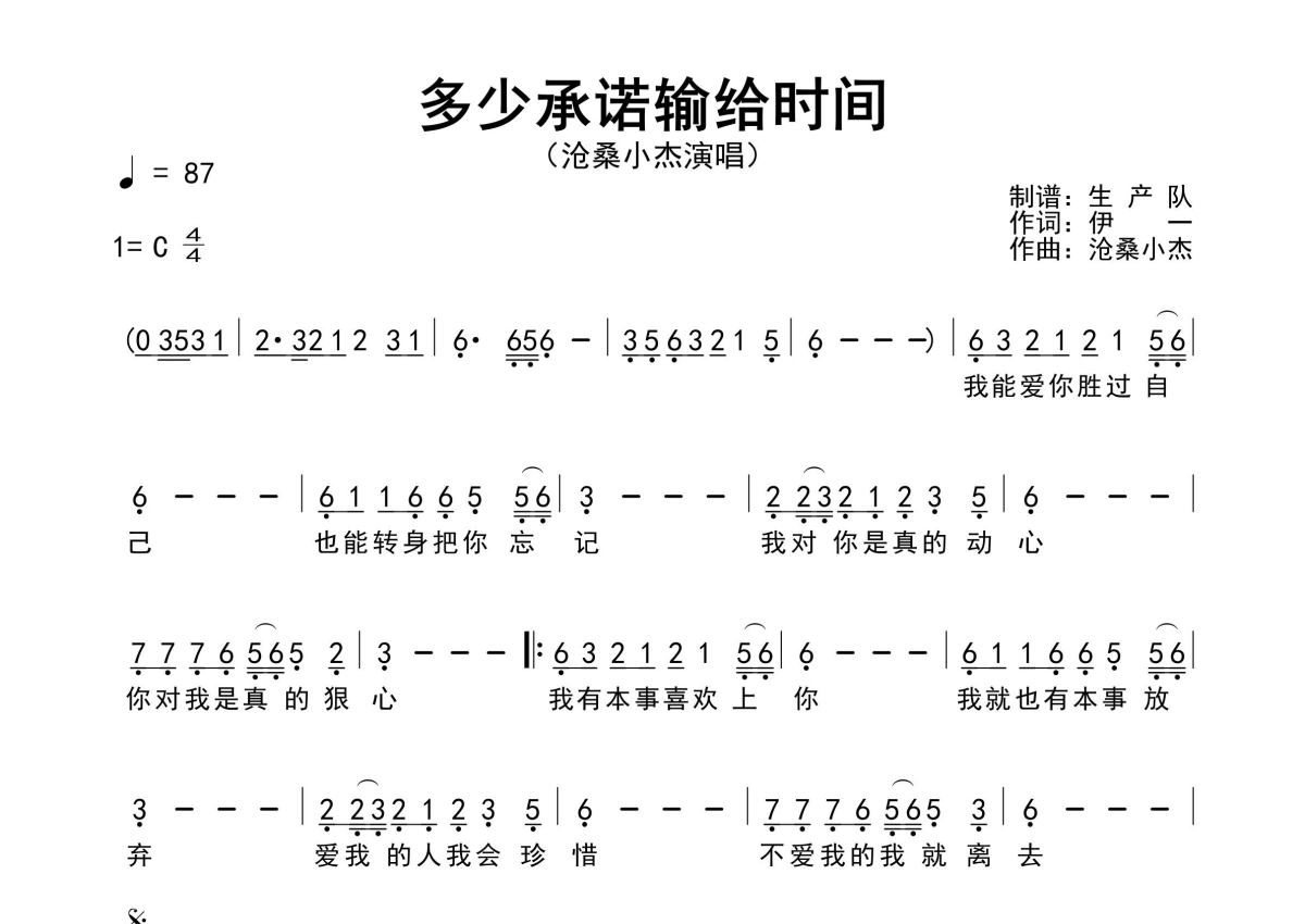 《多少承诺输给时间》是沧桑小杰演唱的一首歌曲,原版简谱,拍号为4/4拍,歌曲速度为每分钟87拍,这份简谱共有一张高清图谱,图谱由 @生产队 编配上传沧桑小杰演唱的歌曲《多少承诺输给时间》原版简谱,含精准的前奏、间奏solo编配,精编完美版,优质推荐!。
