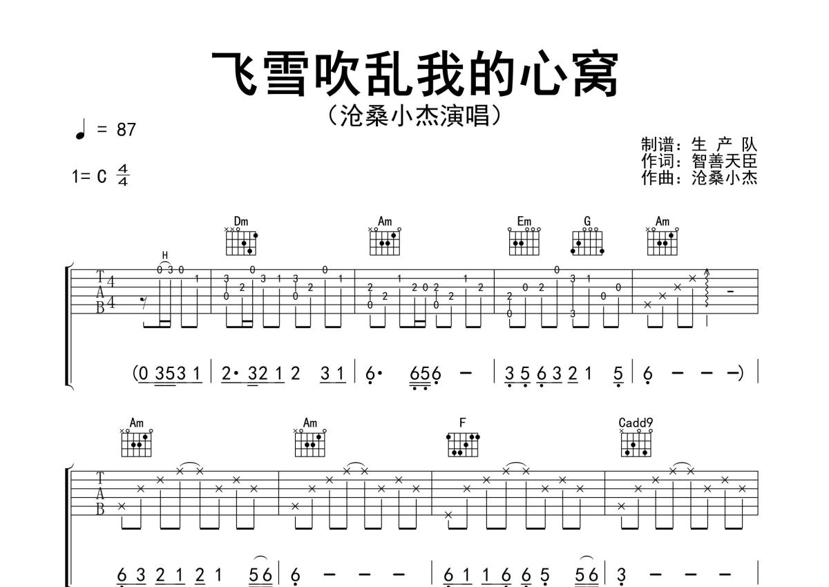 《飞雪吹乱我的心窝》是沧桑小杰演唱的一首歌曲,精编完美版,拍号为4/4拍,歌曲速度为每分钟87拍,歌曲原调为C调,本吉他谱采用的是C调指法编配,演奏时不需要使用变调夹即为原调,这份吉他谱共有三张高清图谱,图谱由 @生产队 编配上传,图谱使用六线谱编配,包含吉他和弦指法、简谱以及歌词部分,使用这份飞雪吹乱我的心窝吉他谱,可以让你更加方便地掌握这首歌曲的弹唱技巧,快来尝试吧。沧桑小杰演唱的歌曲《飞雪吹乱我的心窝》原版吉他谱,含精准的前奏、间奏solo编配,精编完美版,优质推荐!。