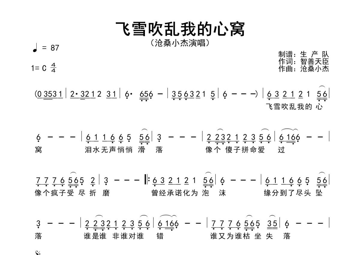 《飞雪吹乱我的心窝》是沧桑小杰演唱的一首歌曲,原版简谱,拍号为4/4拍,歌曲速度为每分钟87拍,这份简谱共有一张高清图谱,图谱由 @生产队 编配上传沧桑小杰演唱的歌曲《飞雪吹乱我的心窝》原版简谱,含精准的前奏、间奏solo编配,精编完美版,优质推荐!。