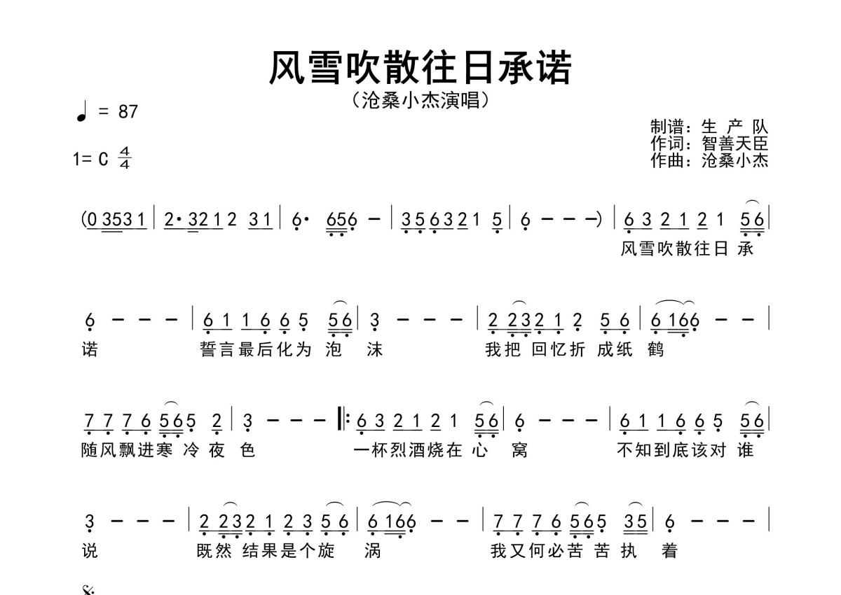 《风雪吹散往日承诺》是沧桑小杰演唱的一首歌曲,原版简谱,拍号为4/4拍,歌曲速度为每分钟87拍,这份简谱共有一张高清图谱,图谱由 @生产队 编配上传沧桑小杰演唱的歌曲《风雪吹散往日承诺》原版简谱,含精准的前奏、间奏solo编配,精编完美版,优质推荐!。