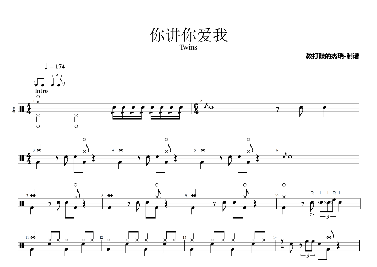 《你讲你爱我》是Twins演唱的一首歌曲,拍号为4/4拍,歌曲速度为每分钟174拍,这份架子鼓谱共有四张高清图谱,图谱由 @Jerry 编配上传,图谱使用五线谱编配,使用这份你讲你爱我架子鼓谱,你将能够轻松地敲打出这首Twins的你讲你爱我,快来尝试吧。