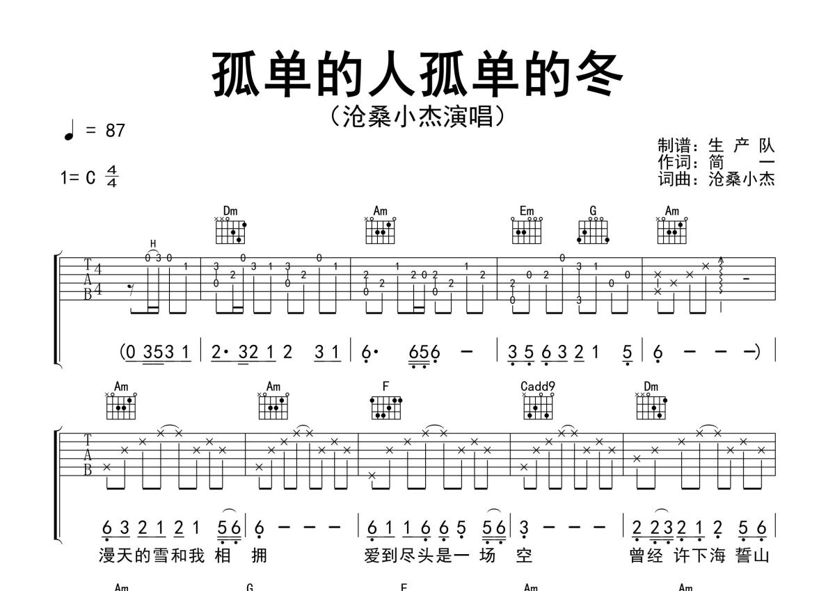 《孤单的人孤单的冬》是沧桑小杰演唱的一首歌曲,精编完美版,拍号为4/4拍,歌曲速度为每分钟87拍,歌曲原调为C调,本吉他谱采用的是C调指法编配,演奏时不需要使用变调夹即为原调,这份吉他谱共有两张高清图谱,图谱由 @生产队 编配上传,图谱使用六线谱编配,包含吉他和弦指法、简谱以及歌词部分,使用这份孤单的人孤单的冬吉他谱,可以让你更加方便地掌握这首歌曲的弹唱技巧,快来尝试吧。沧桑小杰演唱的歌曲《孤单的人孤单的冬》原版吉他谱,含精准的前奏、间奏solo编配,精编完美版,优质推荐!。