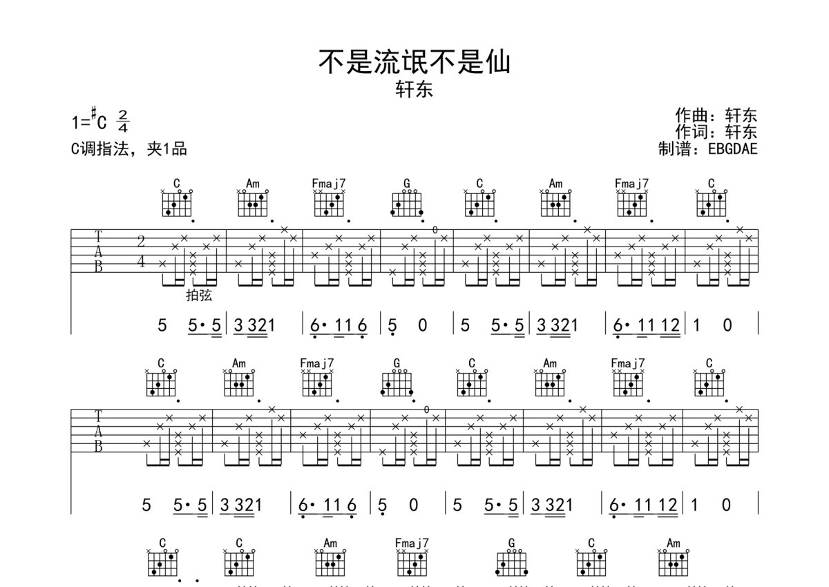 《不是流氓不是仙》是轩东演唱的一首歌曲,本吉他谱采用的是C调指法编配,这份吉他谱共有三张高清图谱,图谱由 @EBGDAE 编配上传,图谱使用六线谱编配,包含吉他和弦指法、简谱以及歌词部分,使用这份不是流氓不是仙吉他谱,可以让你更加方便地掌握这首歌曲的弹唱技巧,快来尝试吧。原版编配,使用拍弦和拍板技巧。物美价廉,放心选购!加油!。