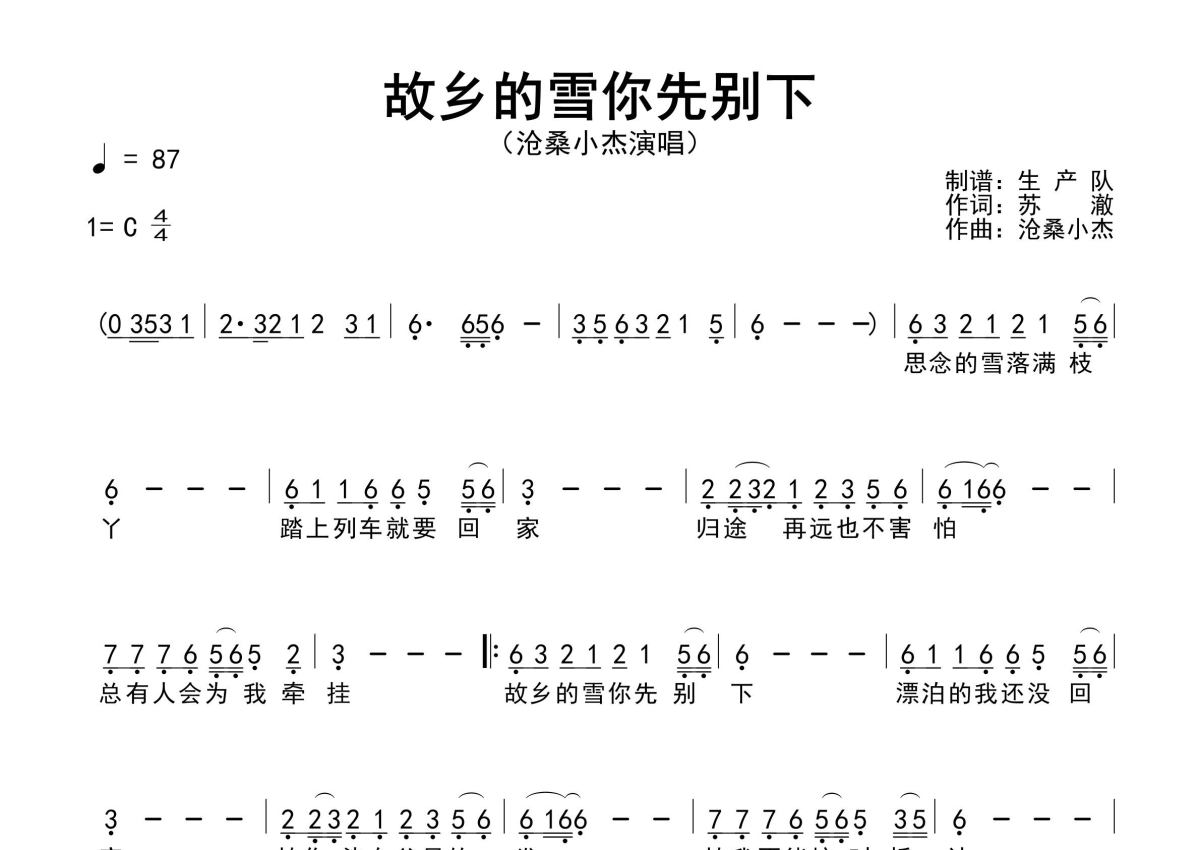 《故乡的雪你先别下》是沧桑小杰演唱的一首歌曲,原版简谱,拍号为4/4拍,歌曲速度为每分钟87拍,这份简谱共有一张高清图谱,图谱由 @生产队 编配上传沧桑小杰演唱的歌曲《故乡的雪你先别下》原版简谱,含精准的前奏、间奏solo编配,精编完美版,优质推荐!。