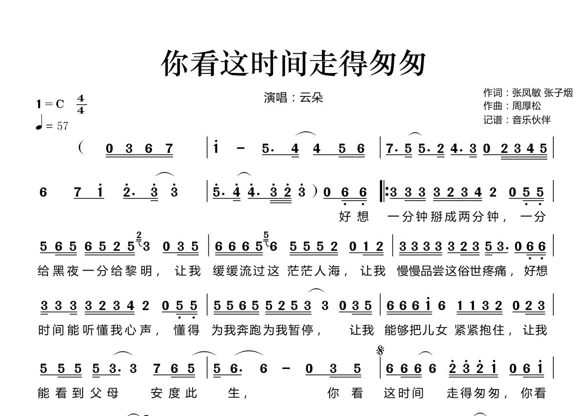 《你看这时间走得匆匆》是云朵演唱的一首歌曲,拍号为4/4拍,歌曲速度为每分钟57拍,这份简谱共有一张高清图谱,图谱由 @音乐伙伴 编配上传。