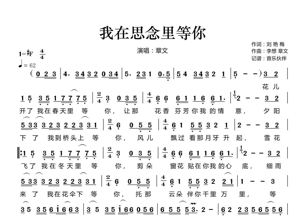 《我在思念里等你》是章文演唱的一首歌曲,拍号为4/4拍,歌曲速度为每分钟62拍,这份简谱共有一张高清图谱,图谱由 @音乐伙伴 编配上传。