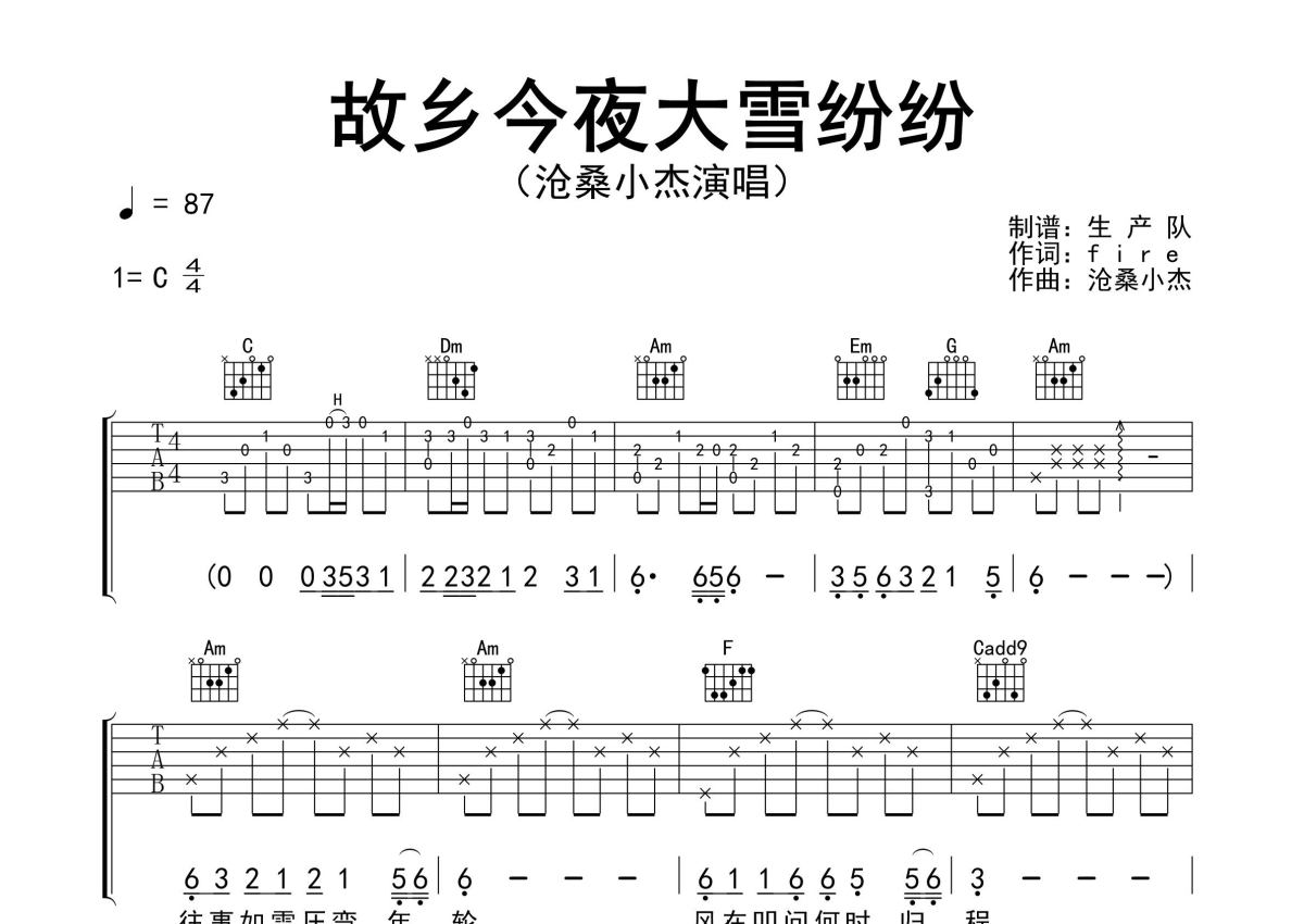 《故乡今夜大雪纷纷》是沧桑小杰演唱的一首歌曲,精编完美版,拍号为4/4拍,歌曲速度为每分钟87拍,歌曲原调为C调,本吉他谱采用的是C调指法编配,演奏时不需要使用变调夹即为原调,这份吉他谱共有三张高清图谱,图谱由 @生产队 编配上传,图谱使用六线谱编配,包含吉他和弦指法、简谱以及歌词部分,使用这份故乡今夜大雪纷纷吉他谱,可以让你更加方便地掌握这首歌曲的弹唱技巧,快来尝试吧。沧桑小杰演唱的歌曲《故乡今夜大雪纷纷》原版吉他谱,含精准的前奏、间奏solo编配,精编完美版,优质推荐!。