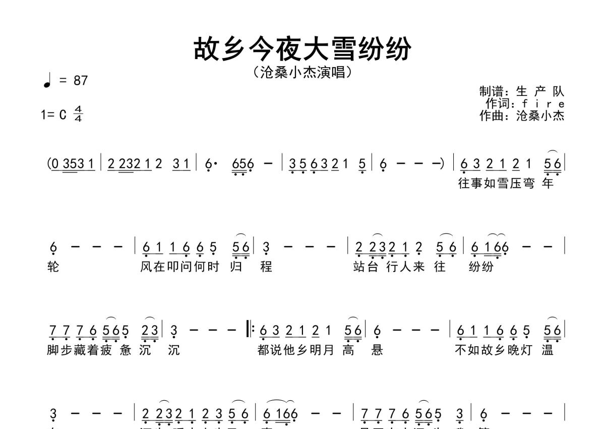 《故乡今夜大雪纷纷》是沧桑小杰演唱的一首歌曲,原版简谱,拍号为4/4拍,歌曲速度为每分钟87拍,这份简谱共有一张高清图谱,图谱由 @生产队 编配上传沧桑小杰演唱的歌曲《故乡今夜大雪纷纷》原版简谱,含精准的前奏、间奏solo编配,精编完美版,优质推荐!。