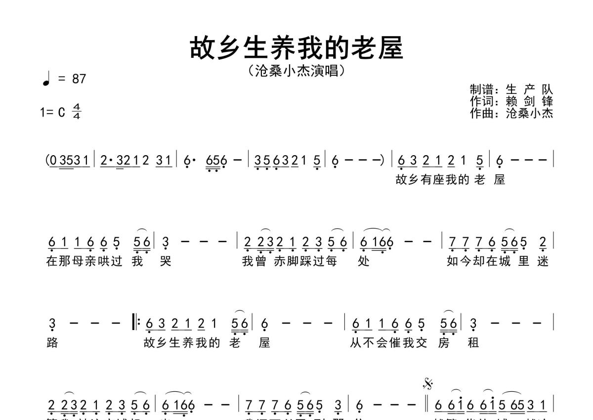 《故乡生养我的老屋》是沧桑小杰演唱的一首歌曲,原版简谱,拍号为4/4拍,歌曲速度为每分钟87拍,这份简谱共有一张高清图谱,图谱由 @生产队 编配上传沧桑小杰演唱的歌曲《故乡生养我的老屋》原版简谱,含精准的前奏、间奏solo编配,精编完美版,优质推荐!。