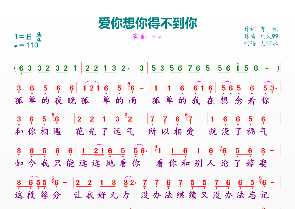 爱你想你得不到你简谱 - 方辰演唱